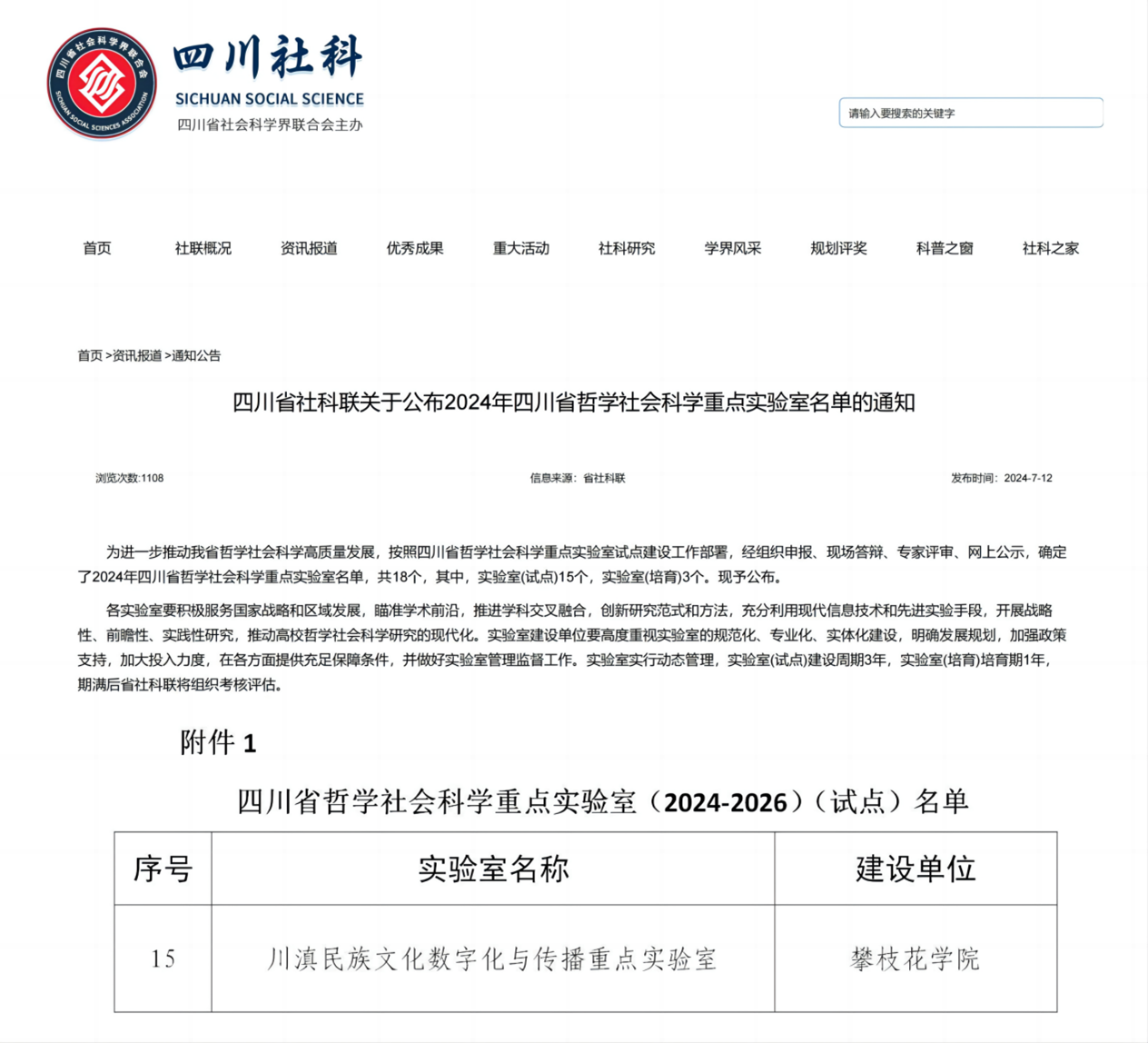 近日,四川省社科联正式公布了2024年四川省哲学社会科学重点实验室名单,全省共31个实验室参与申报,最终入选18个,其中,实验室(试点)15个,实验室(培育)3个。由今年会官方网站牵头申报的“川滇民族文化数字化与传播重点实验室”成功获批。