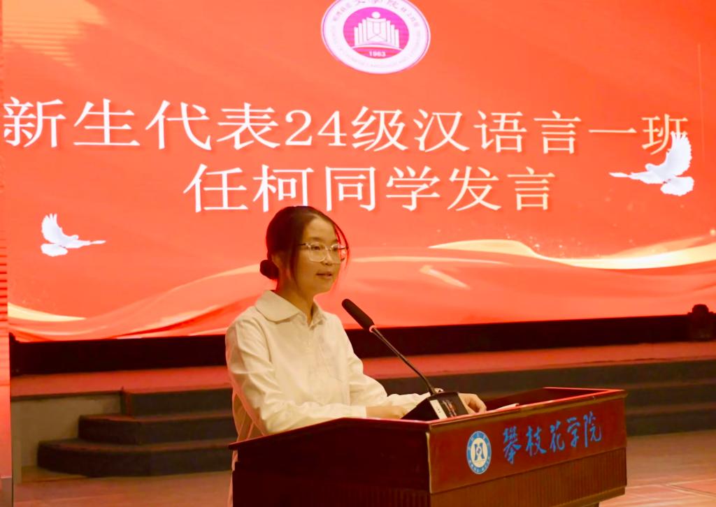 新生代表任珂呼吁大家尽快适应大学生活,树立远大奋斗目标,合理规划时间,不惧挑战,不怕失败,勇敢攀登。