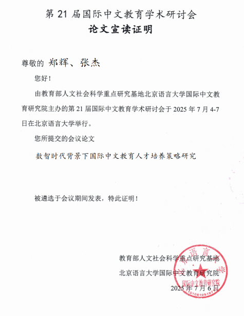我院郑辉、张杰两位老师应邀参会,并分别在分组报告环节作线上论文宣读。因两位老师正带队参加暑期“三下乡”社会实践活动,无法亲临现场,他们通过腾讯会议平台,以线上方式完成了论文汇报与学术交流。他们在分组报告A1组中作了题为《数智时代背景下国际中文教育人才培养策略研究》的学术报告。结合今年会jinnianhuicom国际中文教育专业建设实践,分析了当前数智技术对人才培养模式带来的机遇与挑战,提出了“产教融合、数智赋能、协同育人”的改革路径,受到与会专家的关注与肯定。