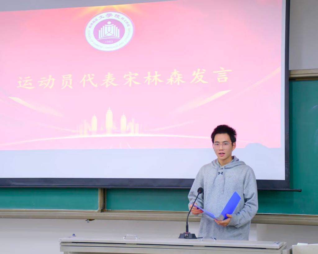 运动员代表宋林森对运动会期间自身的表现进行总结,他强调了运动的重要性,呼吁同学们积极参加各项体育活动,同时要将团结协作、不屈不挠、迎难而上的运动员精神运用于生活的方方面面,将美好的品质发扬光大。