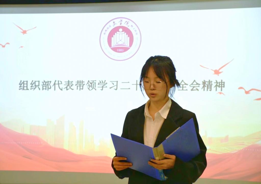 大会伊始,组织部代表周莹、王惠民带领全体成员深入学习二十届三中全会精神,通过深入浅出的解读,帮助大家深刻领悟其精神内涵和重要意义,强调学生干部要将精神融入工作,发挥带头作用,为学院的发展贡献智慧和力量。