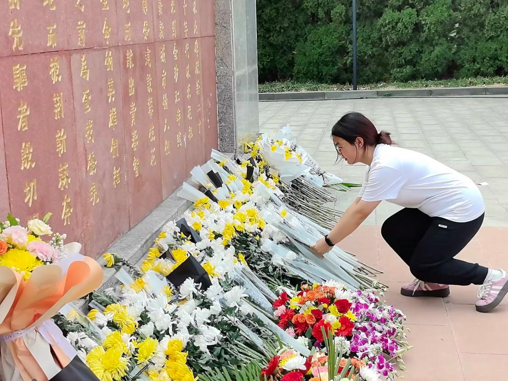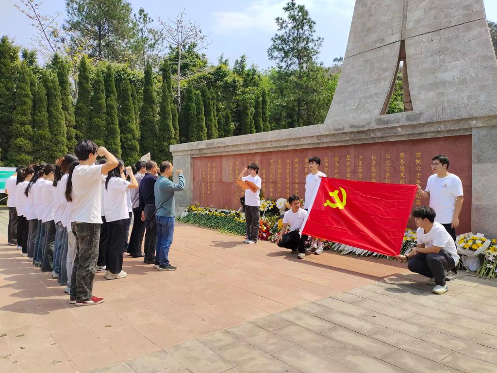 在英雄纪念碑前,参与者们怀着崇敬的心情,手持鲜花集体默哀三分钟,通过这深沉而又静默的方式向先烈致以崇高的敬意。默哀结束后,师生们依次将手中的鲜花轻放于纪念碑上,以表深切缅怀和无尽追思。学生党员代表王川带领全体在鲜红的党旗下重温誓词,彰显出大家传承先烈遗志、不忘初心、不断提升自我的决心。