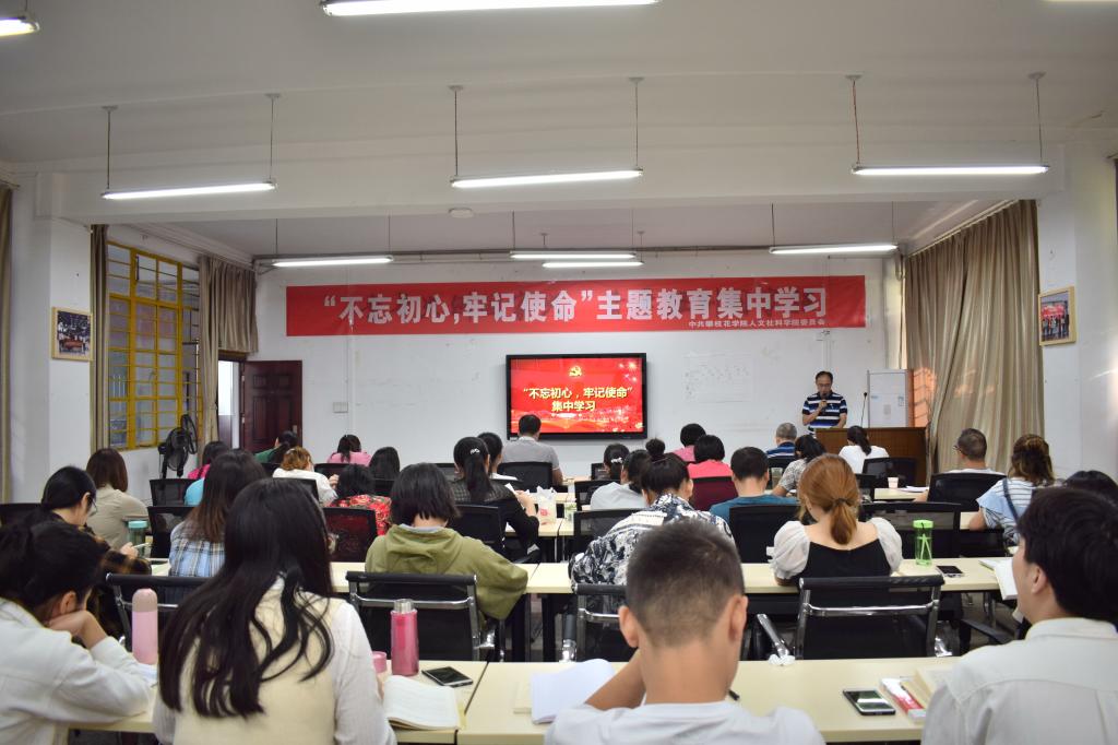 为了更好的贯彻落实“不忘初心,牢记使命”主题教育,积极响应学校要求,2019年10月13日上午,人文社科学院于凌云楼三楼会议室组织开展了“不忘初心,牢记使命”主题教育集中学习会。人文社科学院党委书记薛荐戈,院长文忠波,副院长张琳、曹利华,人文社科学院教工支部成员及学生党支部成员参与了此次主题教育。