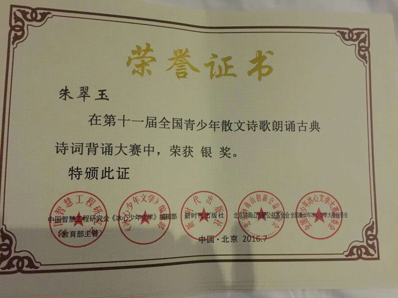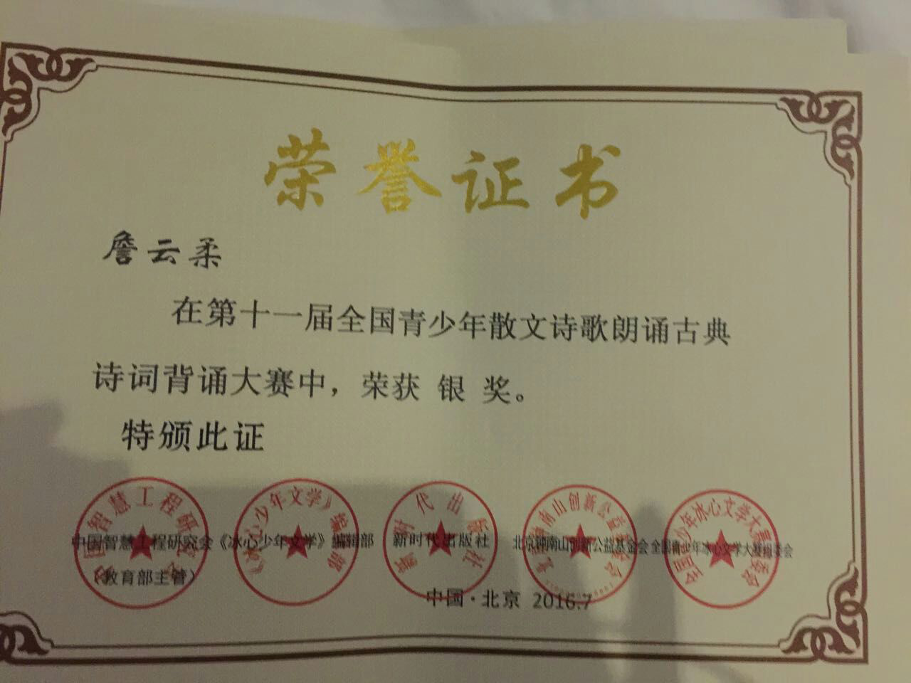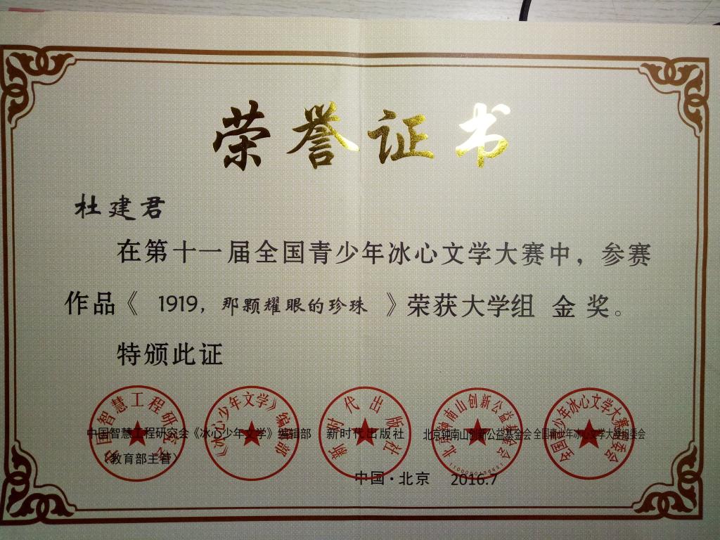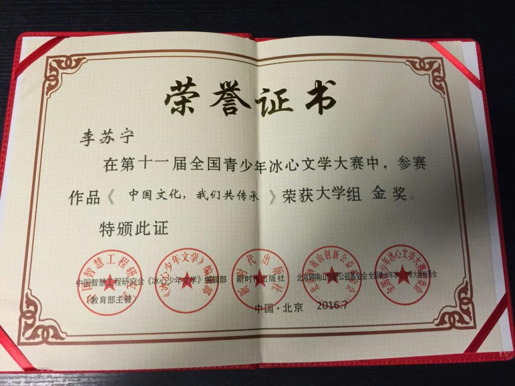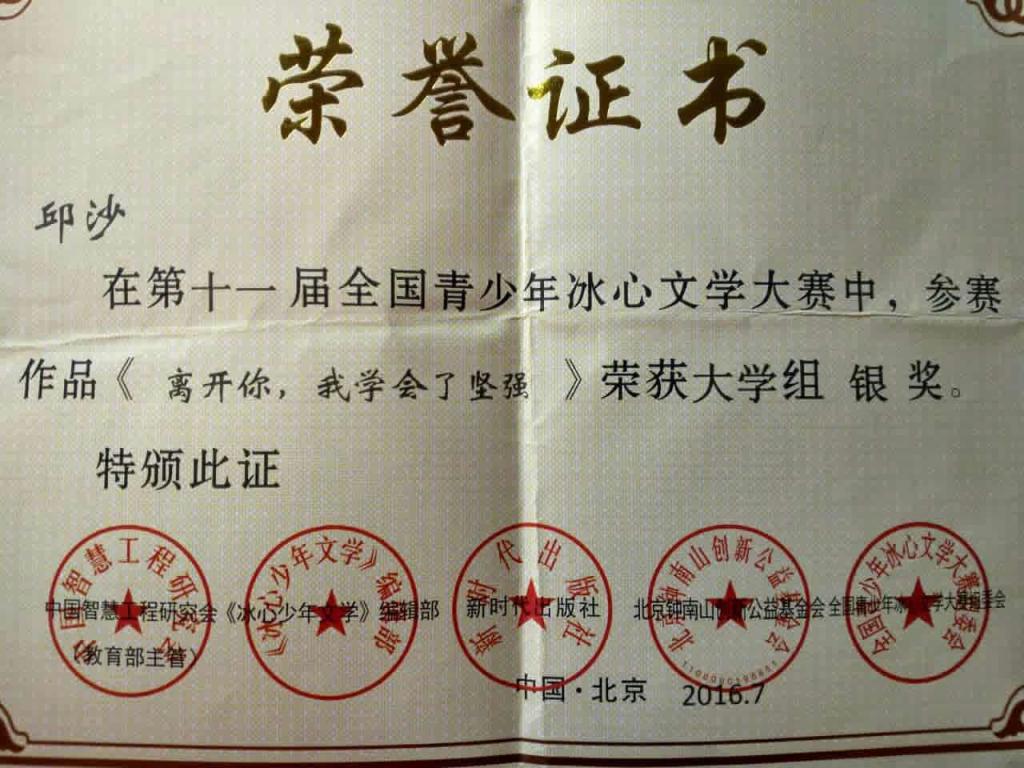 第十一届全国青少年冰心文学大赛获奖荣誉