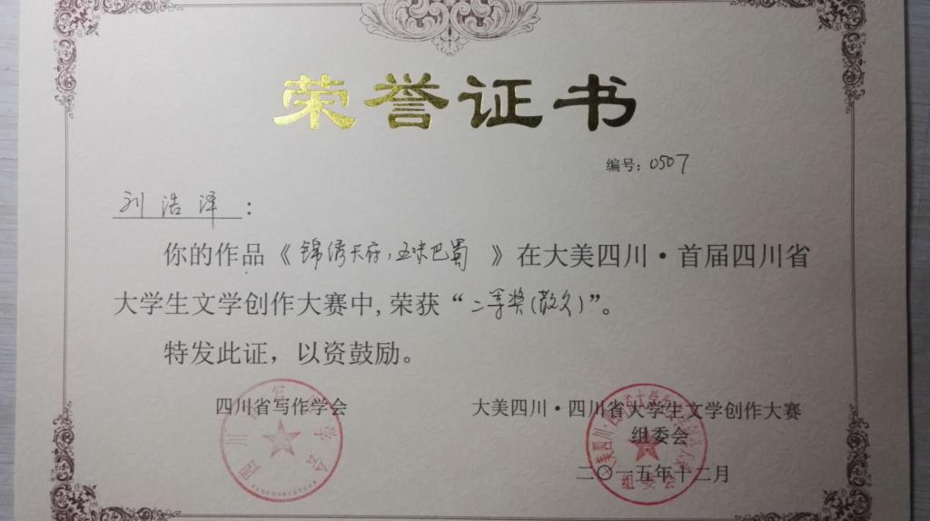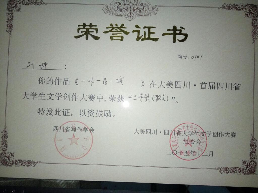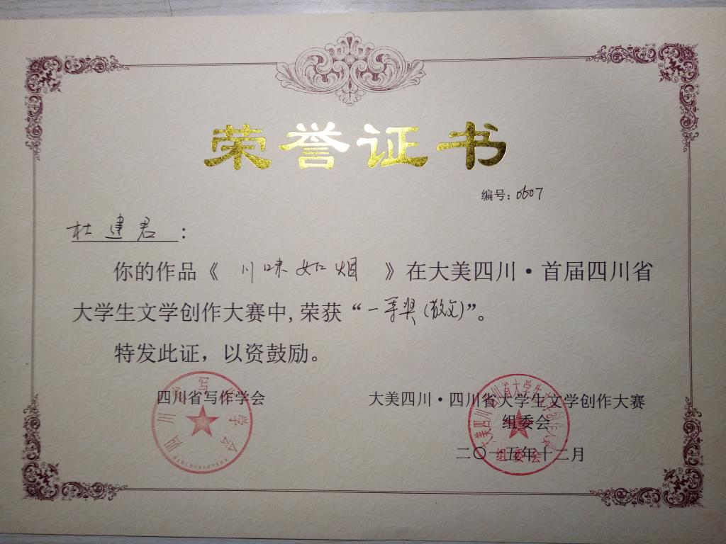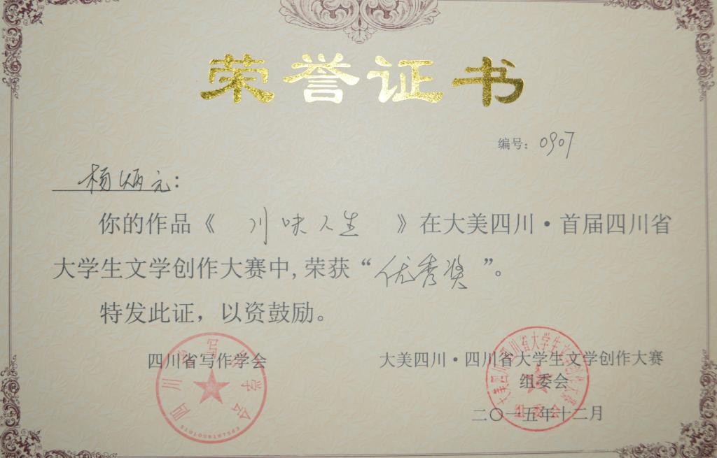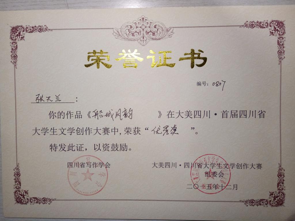 2015年“大美四川•四川省大学生文学创作大赛”获奖荣誉