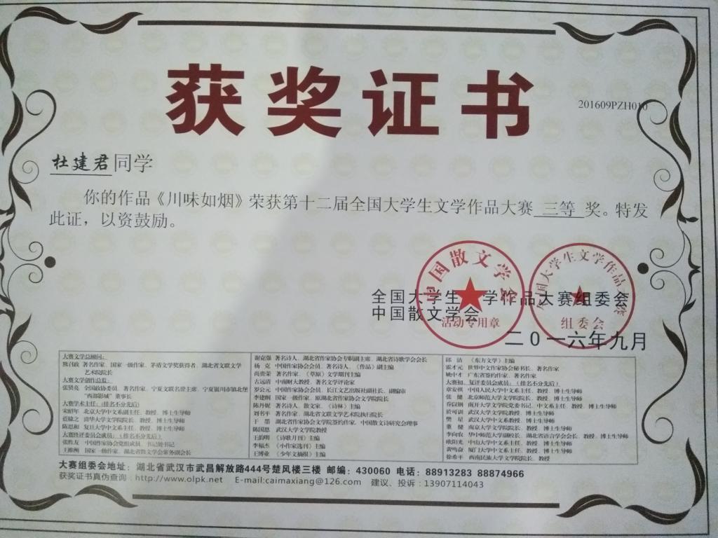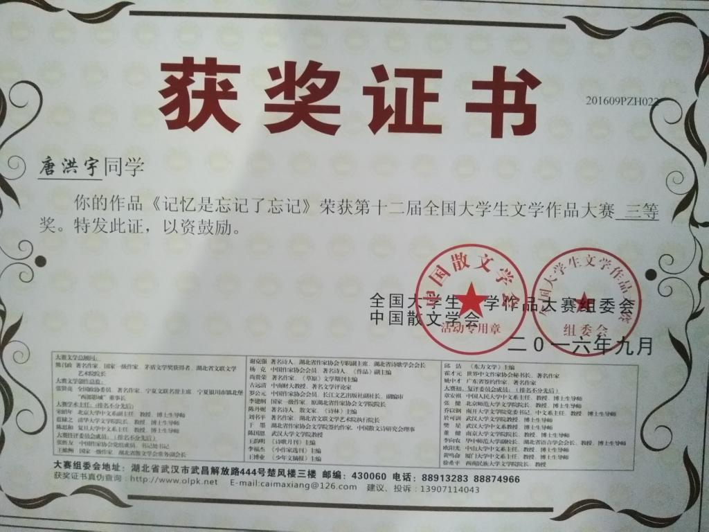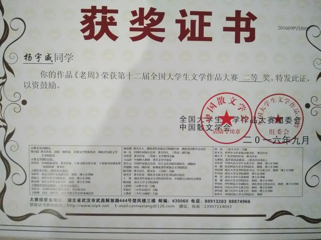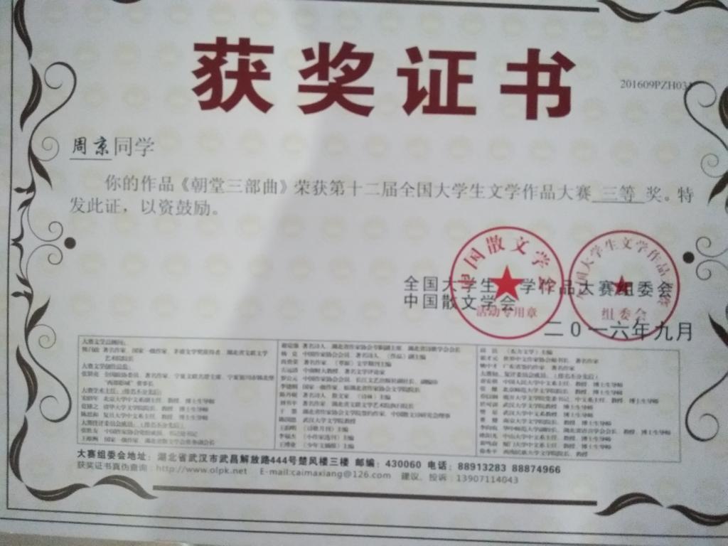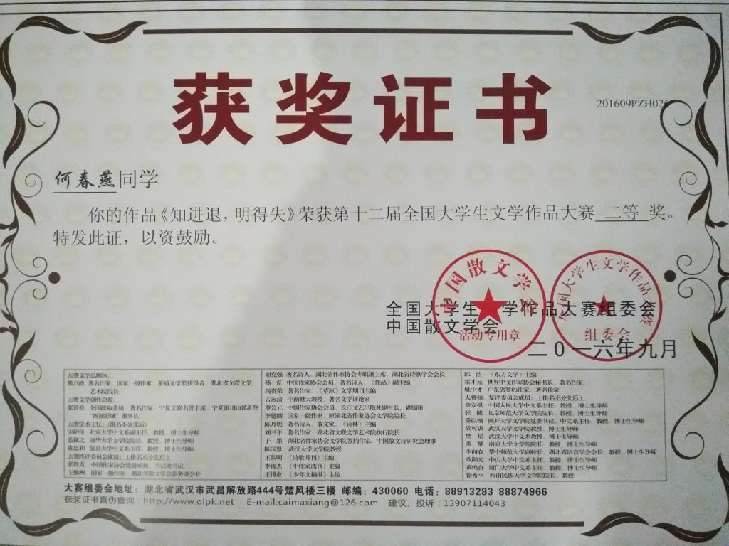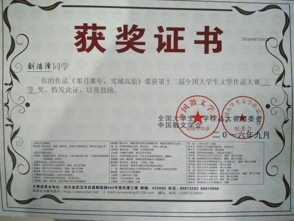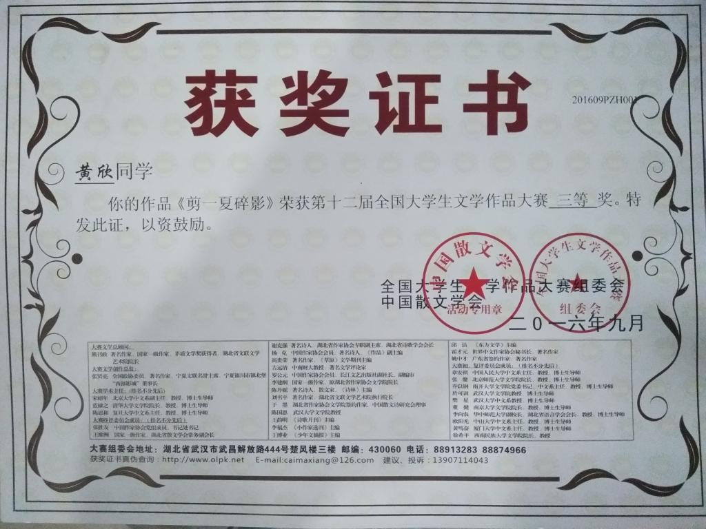 2016年“青春之歌”校园创作大赛获奖荣誉