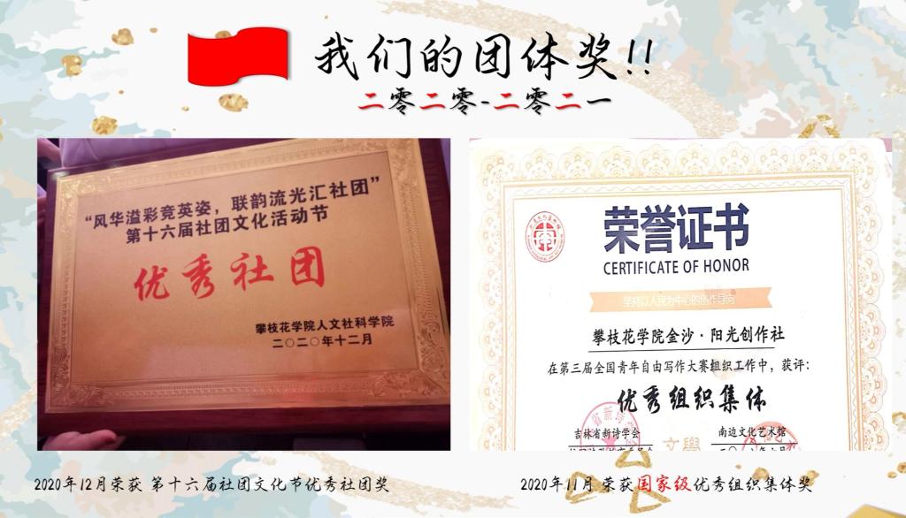 金沙·阳光创作社获得精品社团的荣誉,是对社团打造书香校园、展现文学魅力的肯定与鼓励。未来的金沙·阳光创作社也将不忘初心、砥砺前行,致力于举办更多的优质活动,让更多人领略文学的魅力,让“明德砺志,博学笃行”的校训深深扎根于每一位攀大学子的心中。