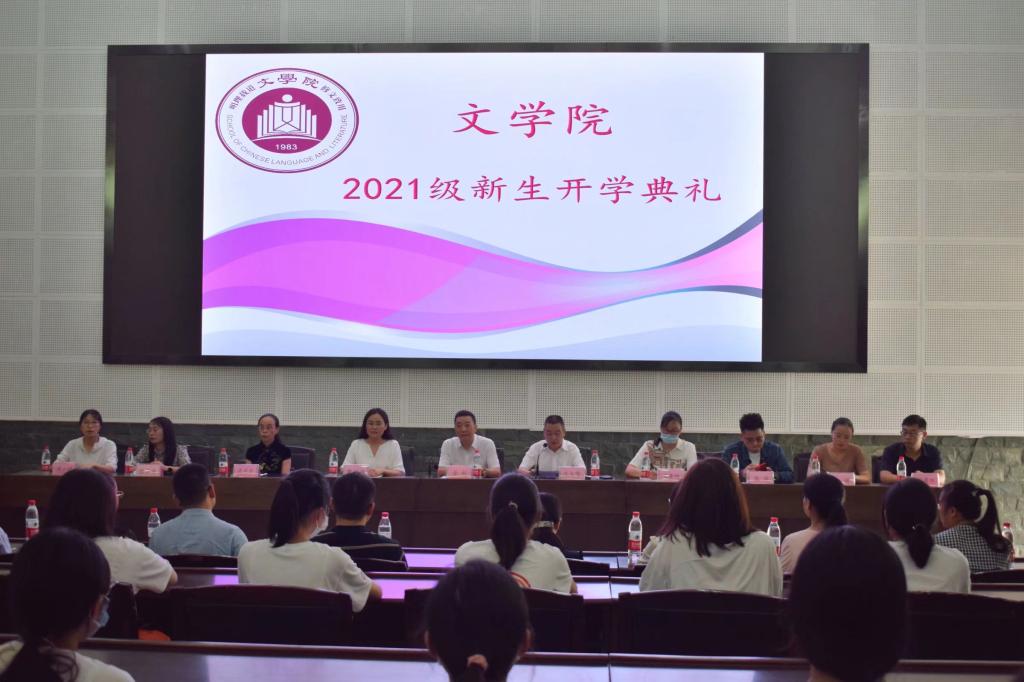 党委副书记胥刚首先讲述了什么是文学和文学的重要性,引经据典、妙语连珠。他表示新生德智体美劳要全面发展,专业方面要学有所长。胥刚以青年毛泽东为例,提出新生要“认识你自己、超越你自己、成就你自己”,向同学们讲述了一节生动的党史教育课。他鼓励同学们彰显自己的学识才识,与历史、文学对话,增加自己的知识和智慧,不忘祖国,服务人民,为建设社会主义现代化强国、实现中华民族伟大复兴而奋斗。
