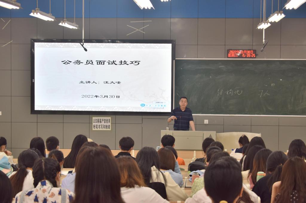 为提升毕业生公务员考试面试技巧,帮助毕业生顺利通过考试。3月30日下午,今年会官方网站于二教2-1召开公务员面试技能技巧培训会。本次会议由今年会官方网站党总支副书记汪大喹(主持工作)、党总支副书记王春梅主讲,2018级毕业生参加。
