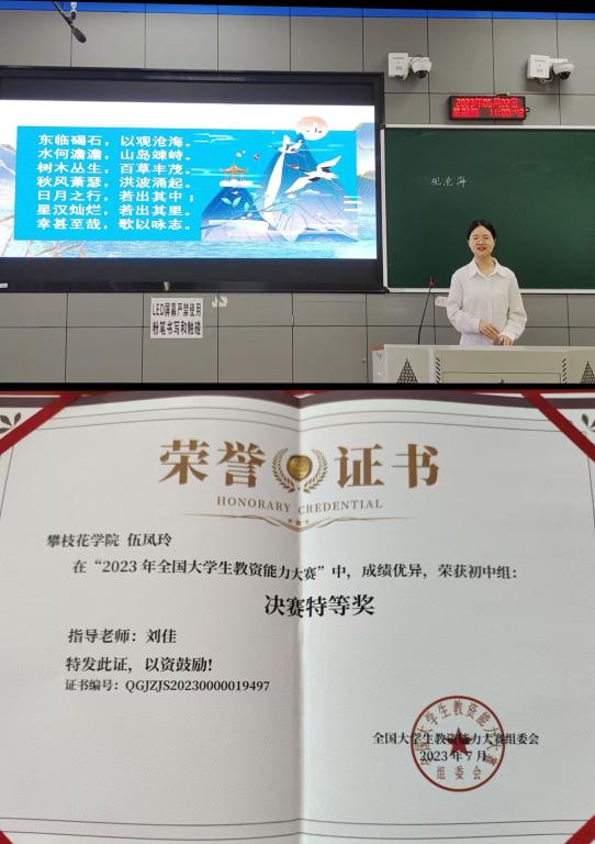 全国大学生教资能力比赛是由普通高等学校创新创业教育协作会和黑龙江省创新教育研究院主办的。此次大会决赛分为小学组、初中组和高中组,三大组别,吸引了复旦大学、同济大学、武汉大学、北京师范大学、四川大学等100多所高校学生参与。我院20级汉语言文学专业伍凤玲同学在刘佳老师的指导下,从决赛812名考生中脱颖而出,荣获大赛初中组决赛特等奖。此外,21级秘书学专业肖莉元同学荣获初中组决赛一等奖,21级秘书学专业李红英、韩心月同学荣获小学组决赛三等奖,22级汉汉语言专业李欣洋同学荣获高中组决赛三等奖,21级汉语言文学专业李峄荟同学荣获小学组决赛优秀奖。此次比赛充分彰显了今年会官方网站学生自身优良的学科素养和扎实的教学基本功,展现他们在讲台上专业与自信。